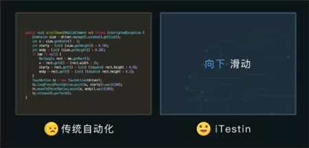 我们先定义了自然语言测试脚本的规则,左边是用代码写的测试脚本,需要懂编程语言。右边就是一句大白话——向下滑动。左边跟右边两个代码效果是一模一样的,用自然语言的方法极大的降低我们编写测试脚本的难度和门槛,这是我们想要实现的一个目的。